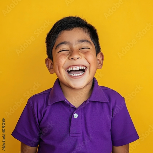 Joyful young schoolboy with black hair in a purple shirt laughing happily against a vibrant yellow background