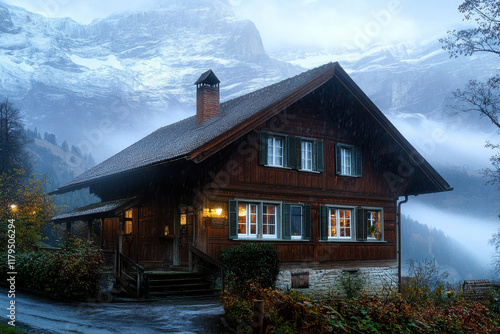 Charming traditional Swiss chalet nestled in a snowy mountain setting