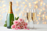 Two champagne glasses with heart bubbles for a romantic Valentine's Day