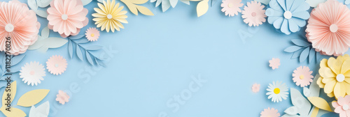 Open blank notebook surrounded by pink flowers on a pastel pink background