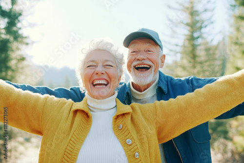 Happy senior couple enjoying the outdoors in a bright and sunny forest.