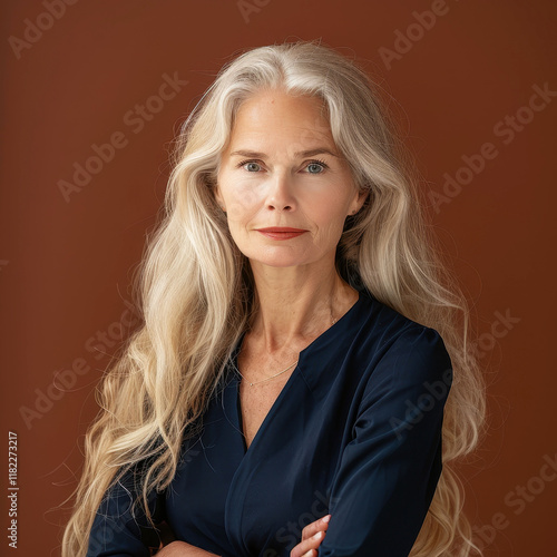 Portrait of a seasoned businesswoman in her 70s with cascading gray hair wearing a silk blouse, exuding confidence and wisdom in a professional setting