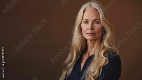 Confident woman in her 40s with short blond hair wearing a black suit, expressing professionalism and poise in a minimalist setting