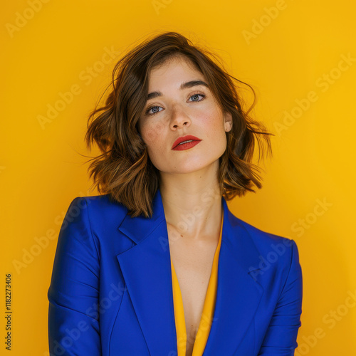 Confident young woman finance analyst with stylish blue blazer against yellow backdrop