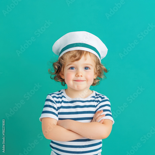 Adorable child dressed as sailor with striped shirt and cap, arms crossed against teal background
