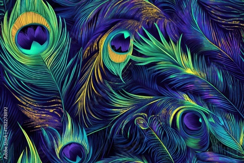 Vibrant peacock feathers with iridescent colors and intricate details