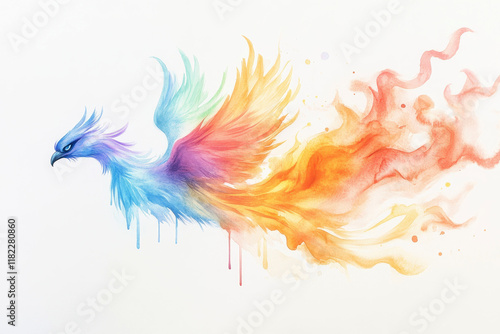 Watercolor painting of a phoenix with vibrant rainbow feathers