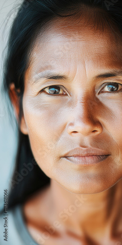 Close-up portrait of a Brazilian woman expressing serene and confident emotions