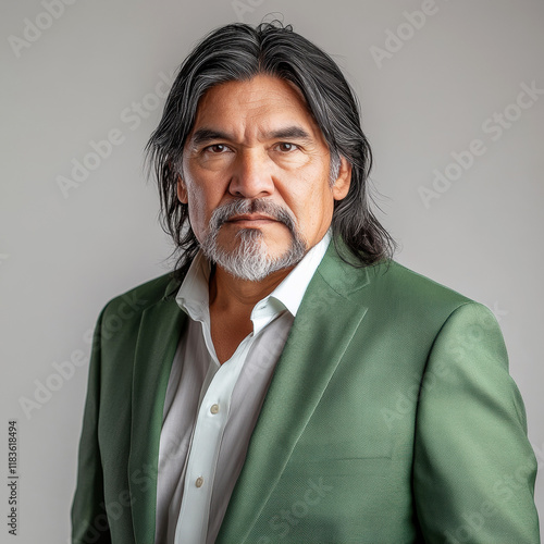 Portrait of a focused mature man in a green jacket with a thoughtful expression, conveying wisdom and confidence