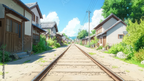 Charming old-fashioned Japanese street with traditional wooden houses and railway