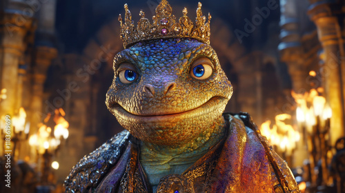 Regal lizard king adorned in royal attire in a grand fantasy setting