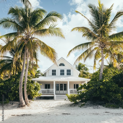 Charming Caribbean beach cottage surrounded by lush palm trees