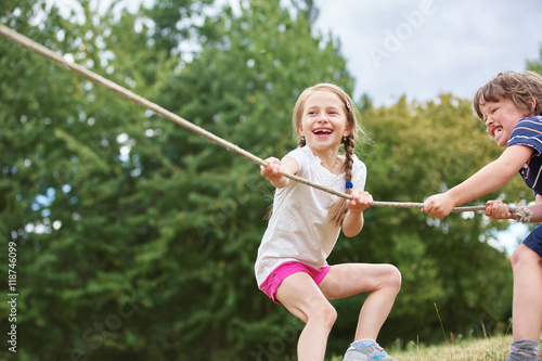 Junge und Mädchen beim Tauziehen