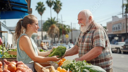 Elderly couple shopping fresh vegetables at a vibrant farmer's market