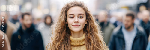 Young woman standing confidently among a bustling urban crowd