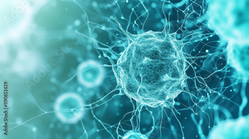 Microscopic view of abstract HMPV virus cells with glowing blue strands