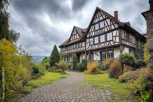 Illustration of classic half-timbered house in beautiful green garden (Generative AI)