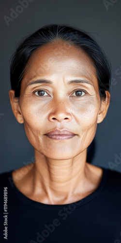 Close-up portrait of a Cambodian woman with an expressive and contemplative look