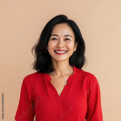 A joyful Middle Eastern woman in her 40s smiling confidently in a vibrant red blouse against a light background