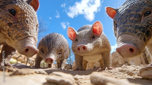 Four adorable armadillos curiously exploring the rocky and sunny desert terrain