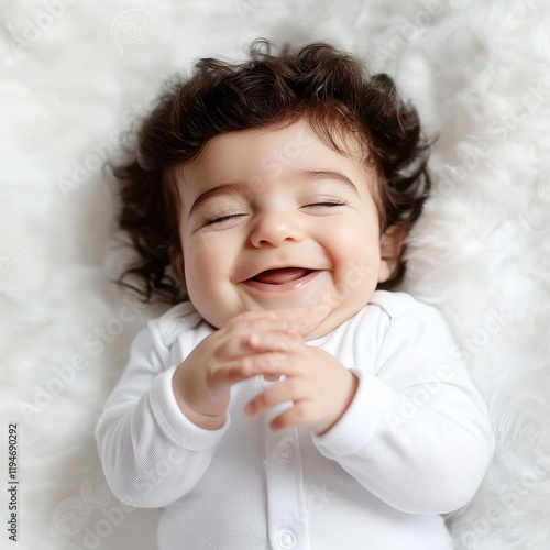 Adorable baby girl with fluffy blonde hair smiling joyfully