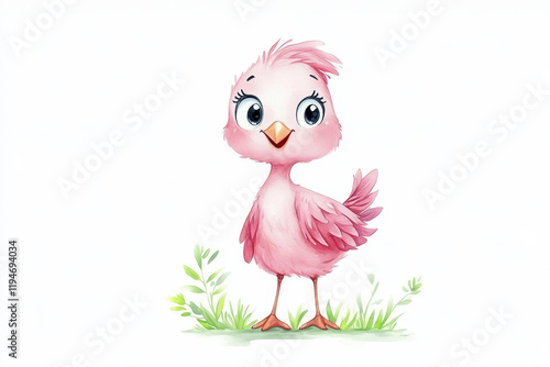 Adorable pink cartoon chick standing on grass with large expressive eyes