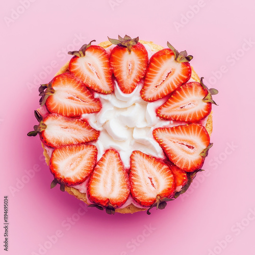 Isolated top view of a single scoop of cherry vanilla ice cream with cherry sauce on white background