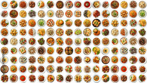 Colorful assortment of various dishes displayed on white plates for culinary presentation
