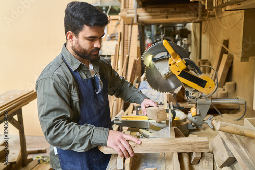 Young carpenter working with wood in a busy lumberyard workshop