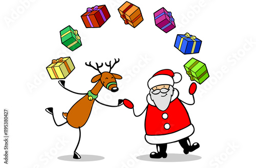 Weihnachtsmann und Rentier jonglieren Geschenke
