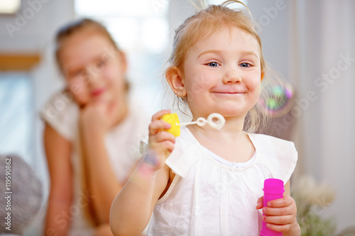 Mädchen pustet Seifenblasen im Kinderzimmer