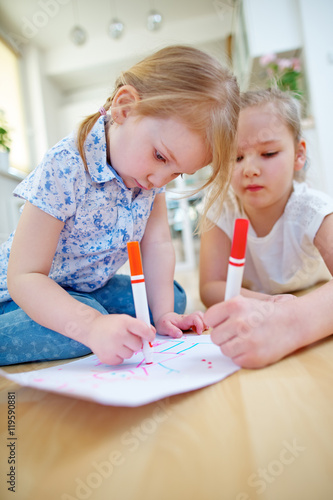Zwei Mädchen malen Bild mit Filzstiften