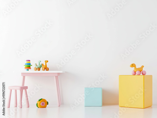 Teddy bear and colorful blocks on a wooden shelf with minimal background