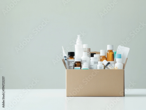 A cardboard box filled with medical supplies and healthcare equipment on white