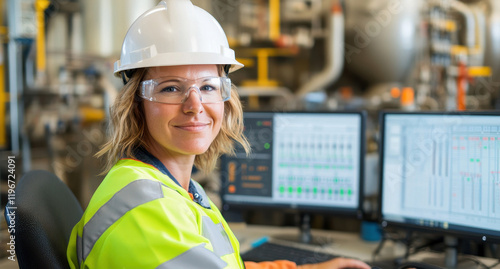 Female engineer at workstation wearing high-visibility jacket and hard hat