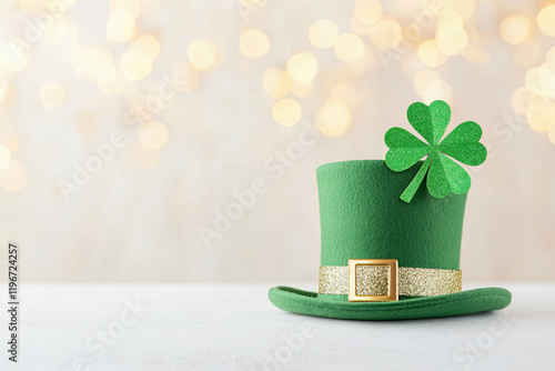 Green top hat with shamrock on festive background for St. Patrick's Day