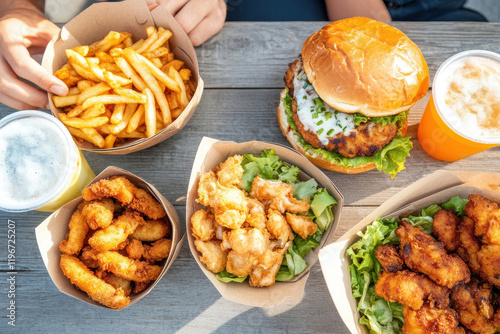 Delicious fast food meal with fried dishes, burger, and refreshing beverages