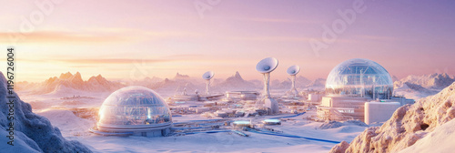 Futuristic Settlement on a Snowy Alien Planet Under a Scenic Sunrise