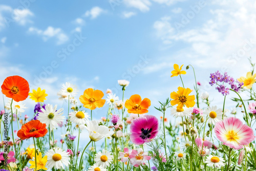 Colorful wildflowers blooming under a vivid blue sky with bright sunlight