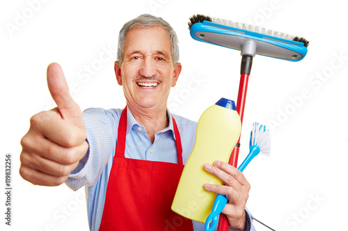 Hausmann beim Frühjahrsputz hält Daumen hoch