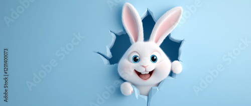 Adorable cartoon bunny peeking through blue paper wall with cheerful expression