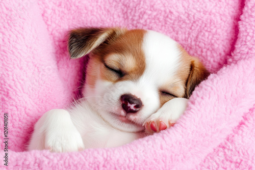 Adorable puppy sleeping on a soft pink blanket, peacefully resting