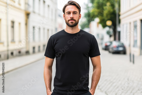 Attractive man wearing a black t-shirt standing outdoors in an urban street