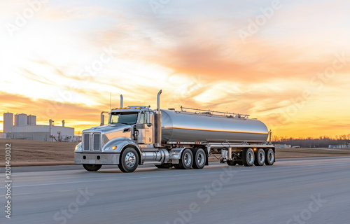 Shiny oil tanker truck driving along road at picturesque sunset with refinery nearby