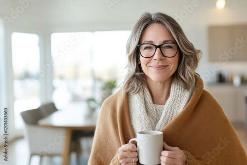 Elegant woman enjoying a hot beverage in a warm and cozy home