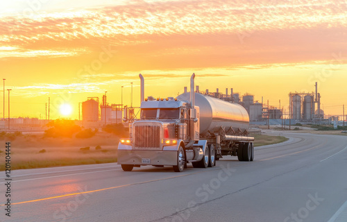Shiny oil tanker truck driving along road at picturesque sunset with refinery nearby