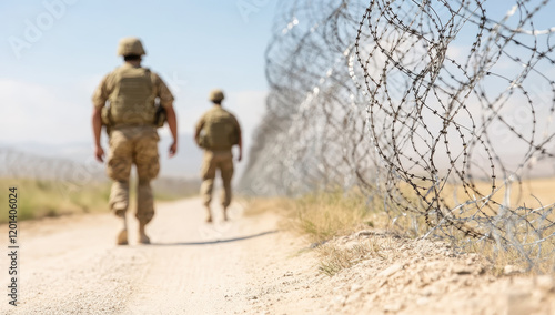 Military soldiers patrolling a dusty border path near barbed wire fencing