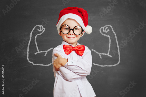 Kind als Weihnachtsmann mit Muskeln auf Tafel