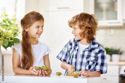 Kinder in der Küche mit Karaffe mit frischem Wasser