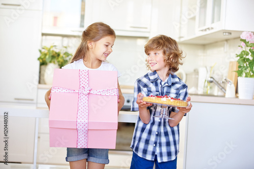 Zwei Kinder mit Kuchen und Geschenk als Überraschung